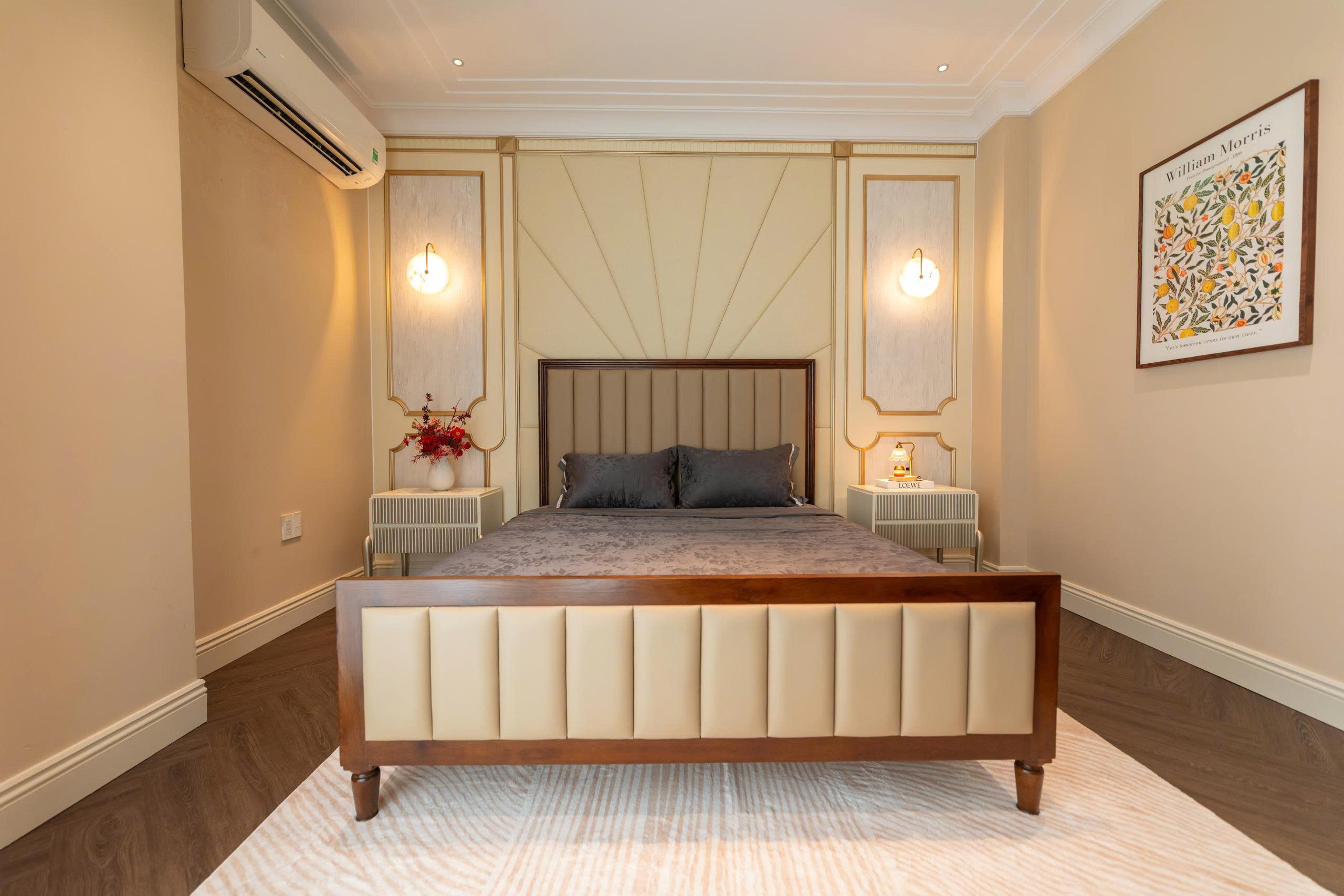Khi kết hợp cùng táp đầu giường tone sáng và hệ đèn tường ánh vàng, tổng thể mang lại cảm giác thư giãn, ấm áp và tinh tế.