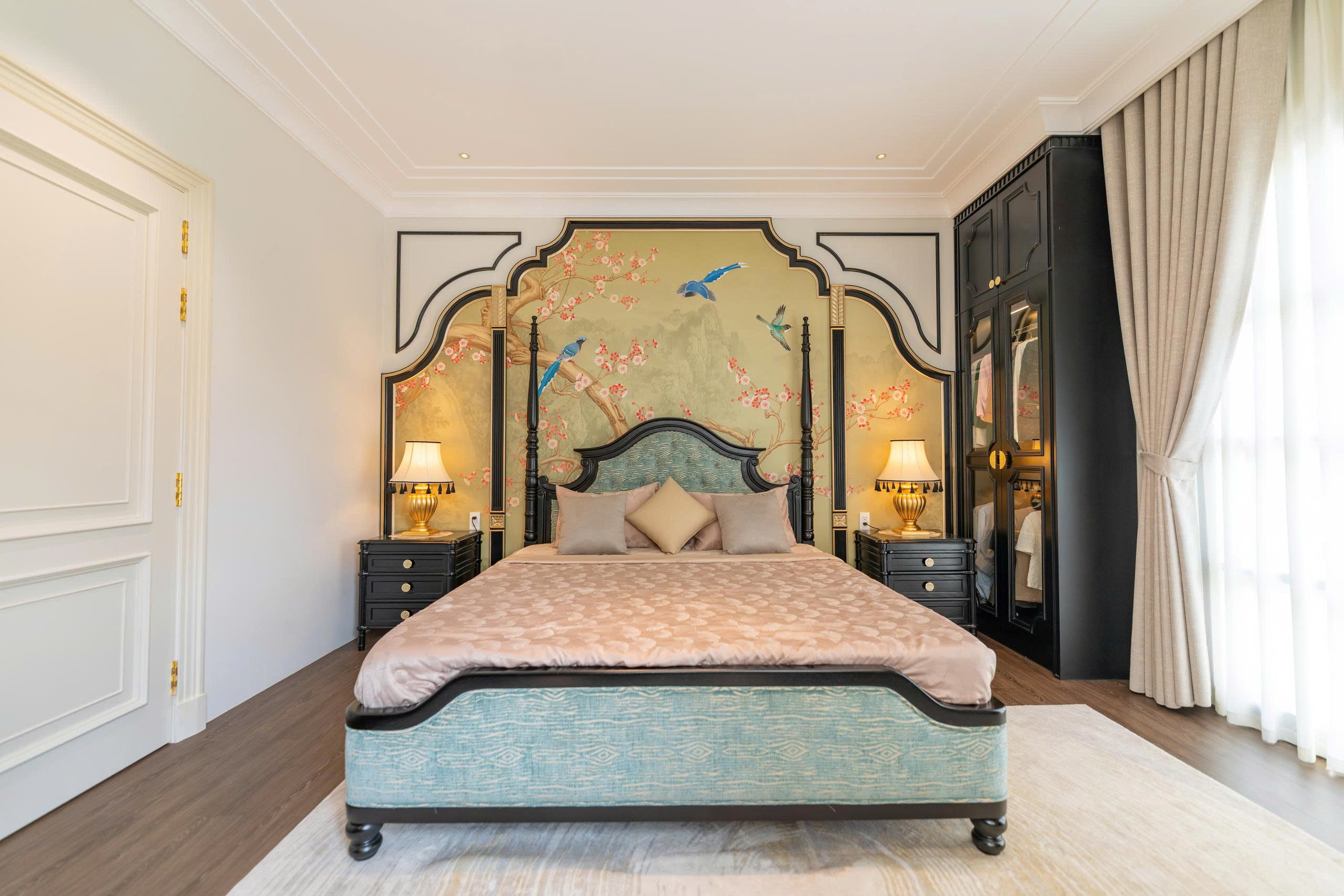 Bố cục đối xứng cùng đường nét uốn lượn đặc trưng Indochine giúp không gian trở nên thanh lịch nhưng không nặng nề.