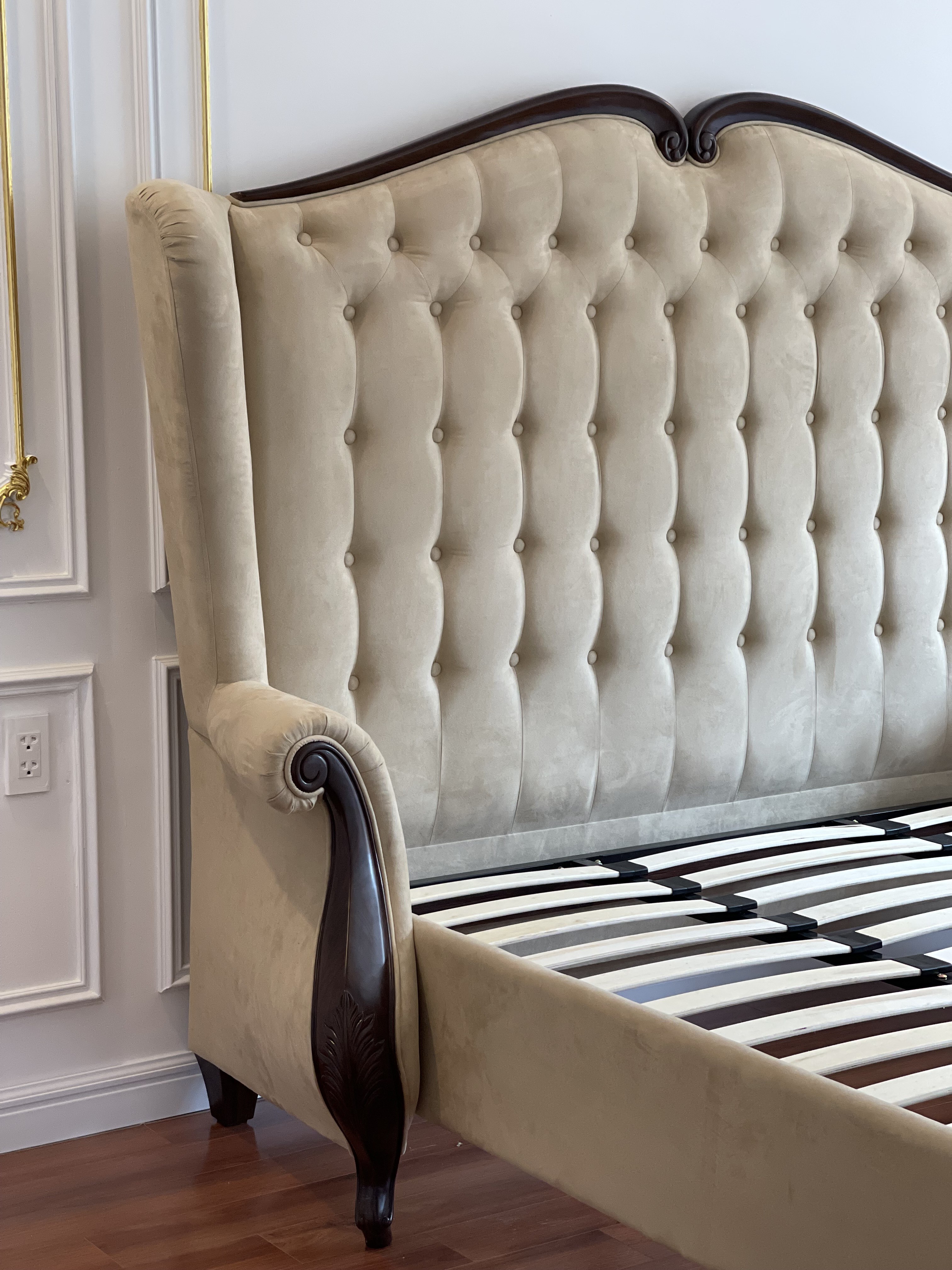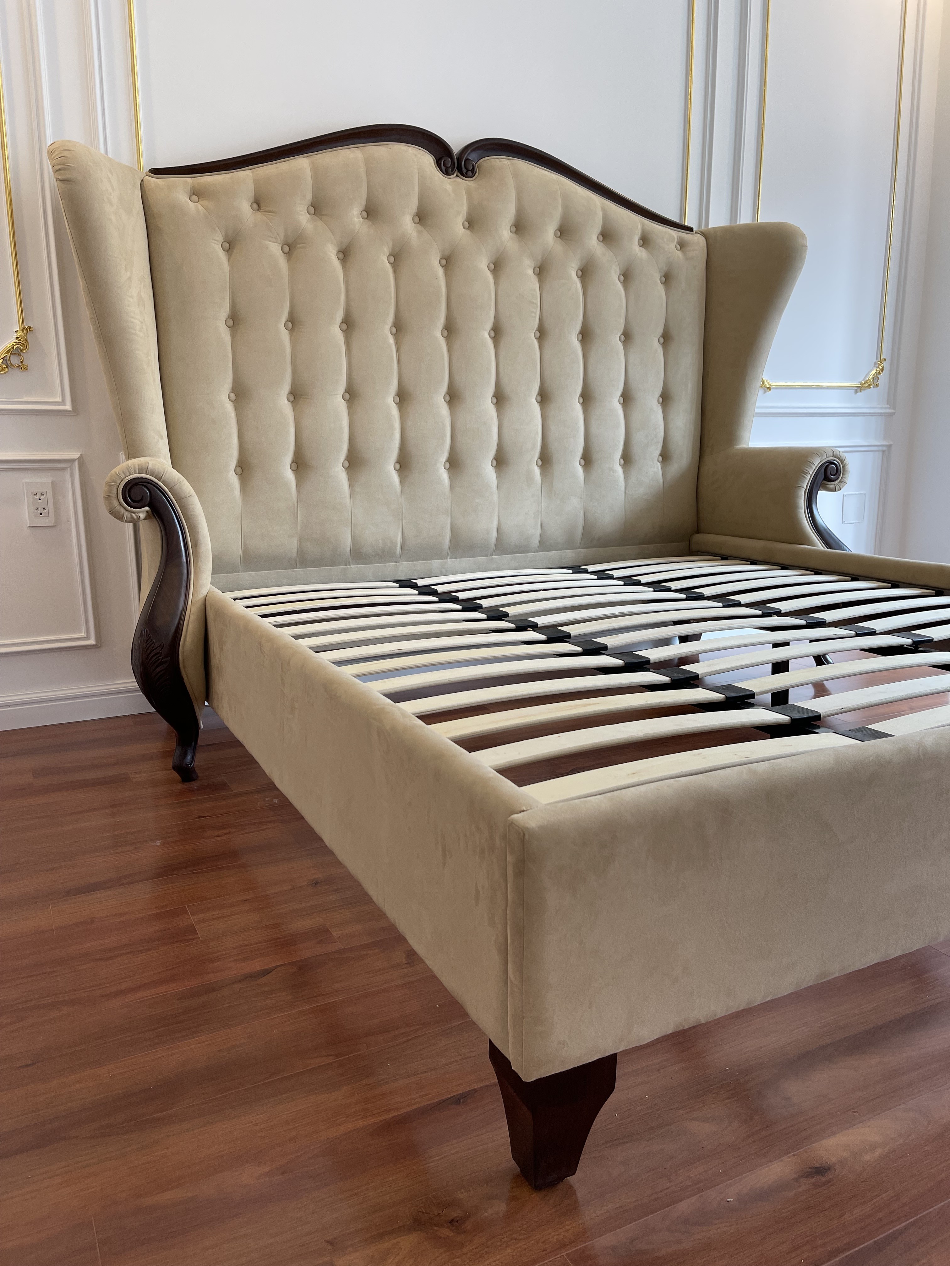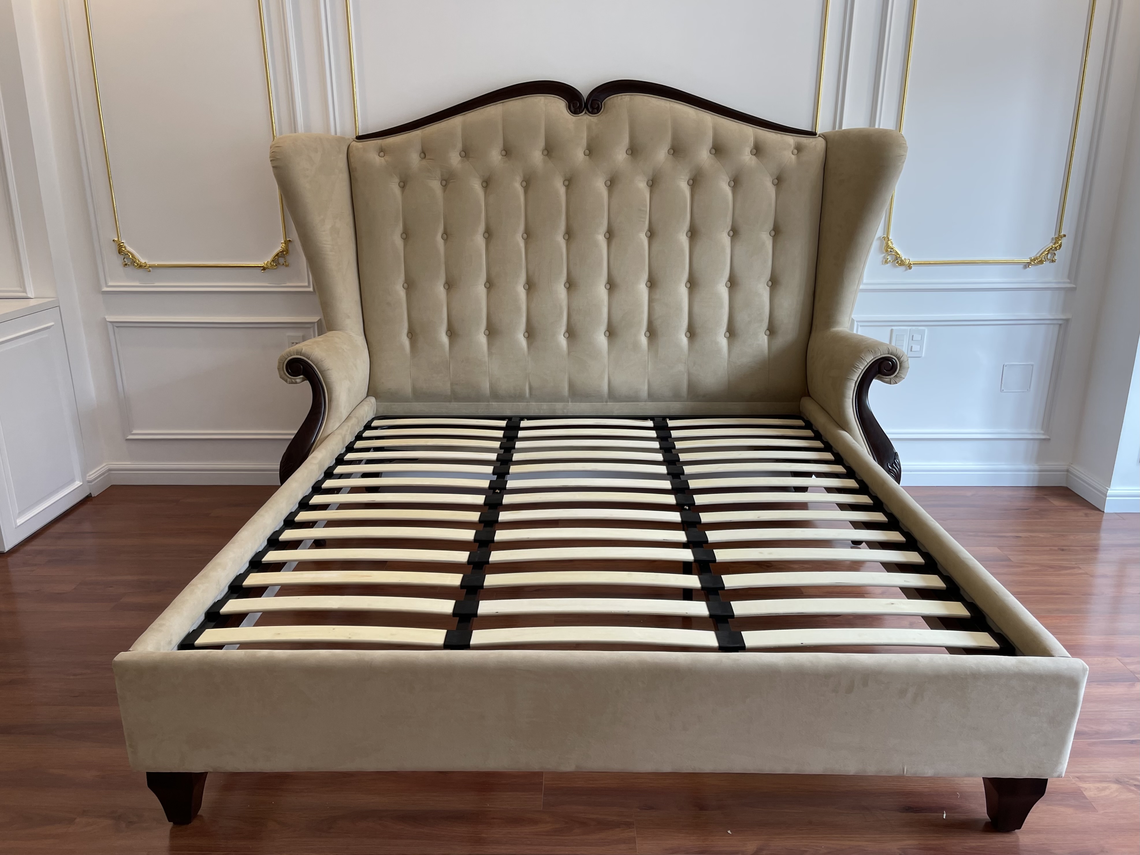Điểm nhấn đặc biệt nằm ở đường viền gỗ chạm khắc tinh tế, uốn lượn đầy nghệ thuật. Những chi tiết hoa văn mang đậm hơi thở châu Âu cổ điển được xử lý sắc sảo, làm toát lên vẻ kiêu sa và quyền quý. Chất liệu gỗ tự nhiên cao cấp kết hợp cùng lớp sơn hoàn thiện tôn thêm sự sang trọng, đồng thời đảm bảo độ bền vượt thời gian