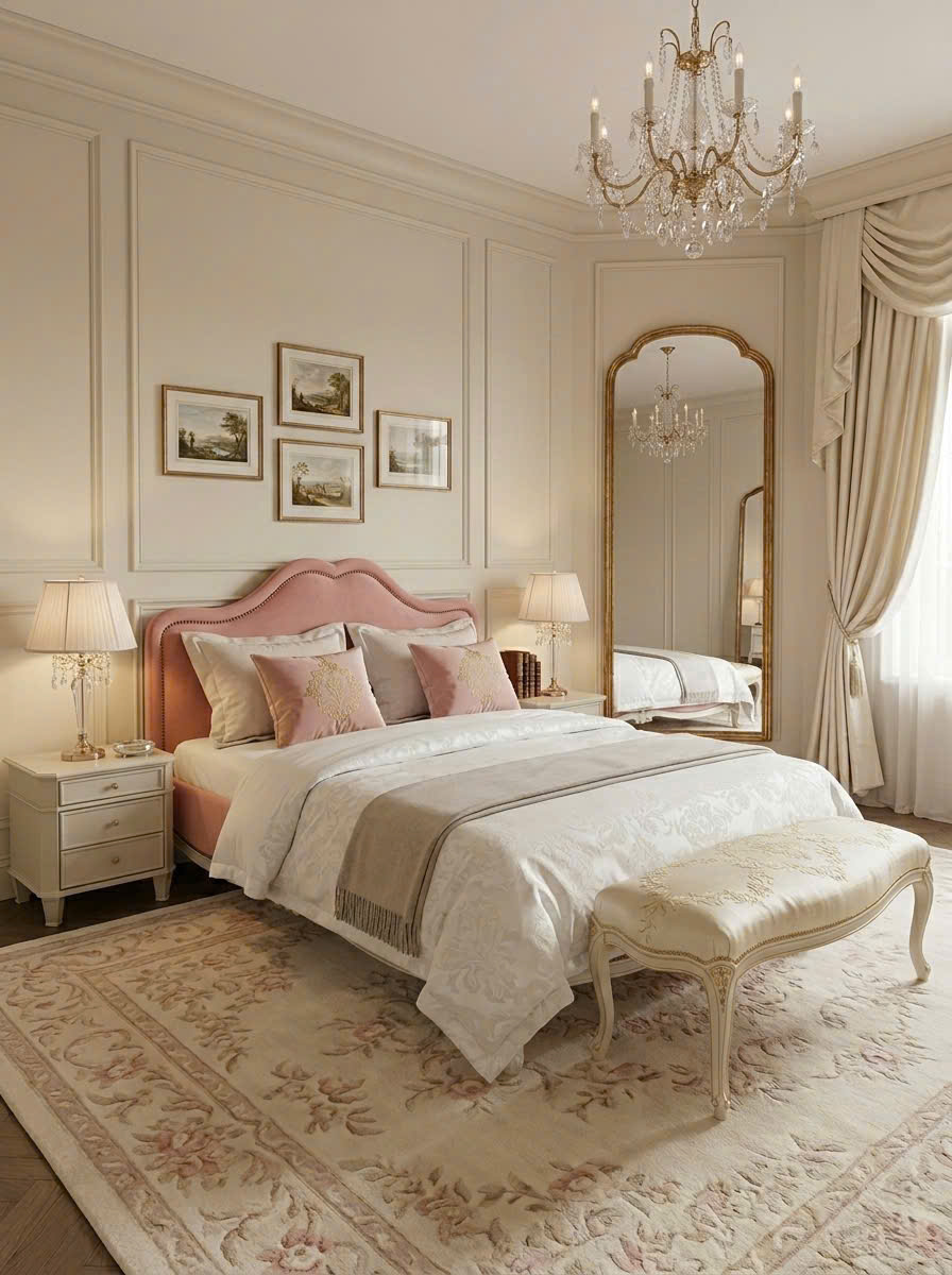 Thiết kế chú trọng đến sự cân đối và hài hòa: hệ tab đầu giường, đèn ngủ và các chi tiết trang trí được bố trí đối xứng, mang lại cảm giác nền nã, chuẩn mực đặc trưng của phong cách tân cổ điển. Tông màu kem – be chủ đạo kết hợp sắc hồng pastel giúp không gian phòng ngủ trở nên nhẹ nhàng, lãng mạn nhưng không kém phần sang trọng.