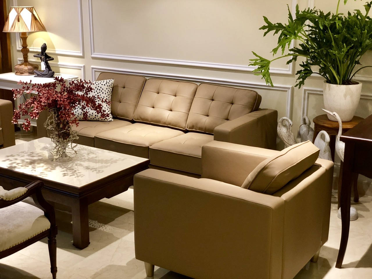 Thiết kế sofa dạng chữ L kết hợp cùng ghế đơn rời, vừa tiết kiệm diện tích vừa tạo sự linh hoạt trong bố trí. Tựa lưng và nệm ngồi được may nhấn nút tinh tế, vừa mang lại nét sang trọng, vừa giúp giữ phom dáng hoàn hảo theo thời gian. Phần tay vịn vuông vức, chắc chắn tạo nên sự cân đối, khỏe khoắn cho tổng thể sản phẩm.